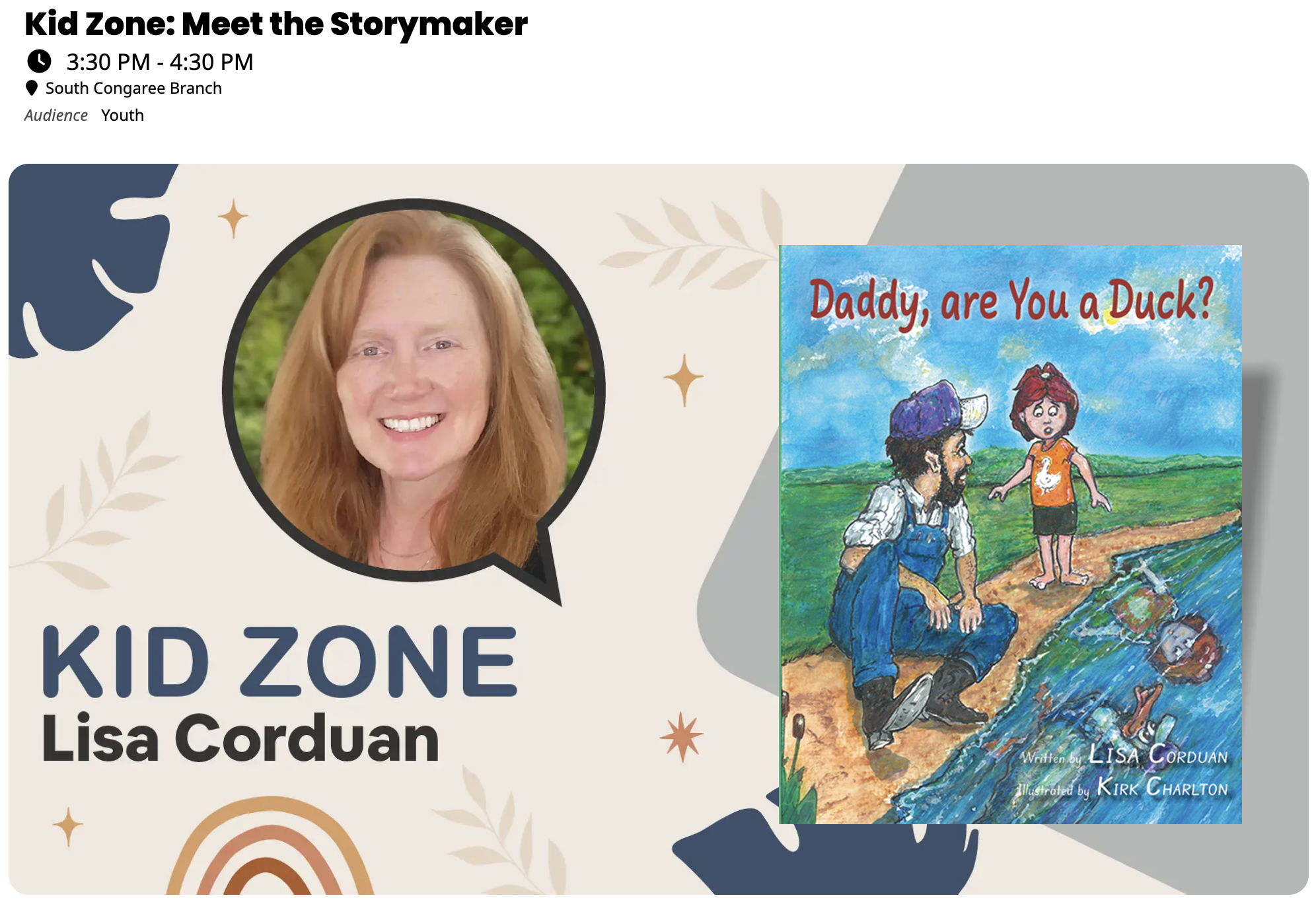 Meet local children’s author Lisa Corduan. Hear about her books, writing process and what it takes to bring stories to life.